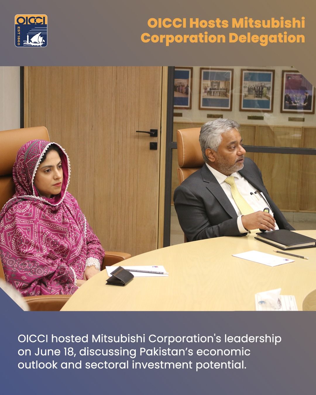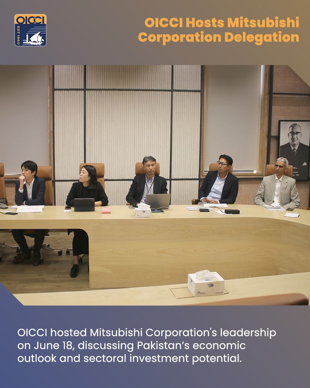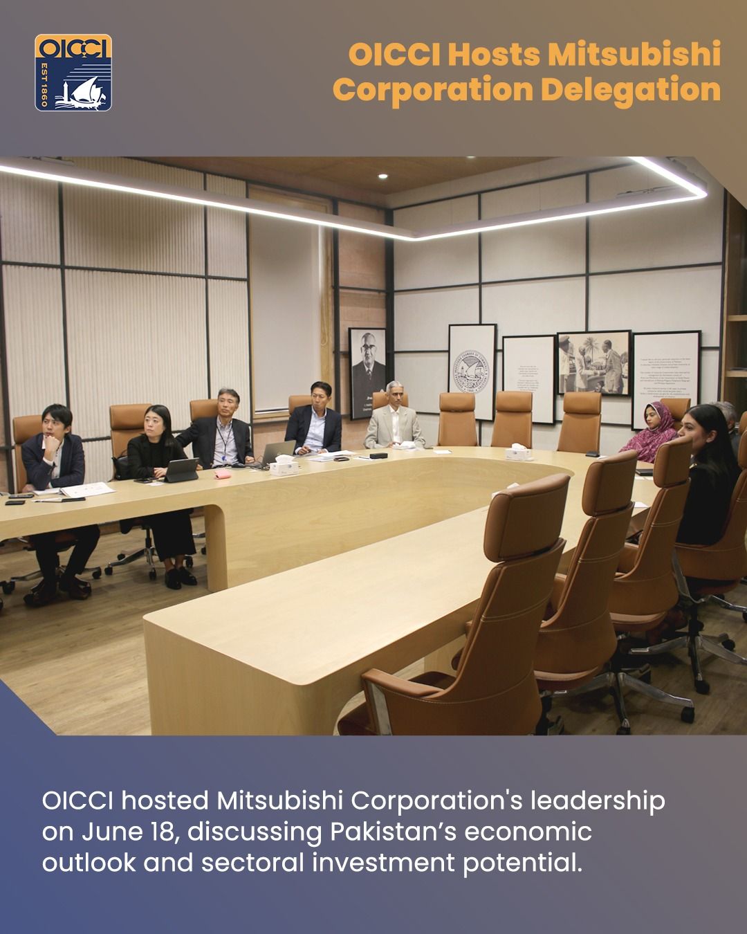 OICCI welcomed a delegation from Mitsubishi Corporation which included TOMOYUKI NISHIDA, Deputy Chief Regional Officer Asia & Oceania, Khozema Darukhanawalla, Deputy General Manager, Corporate Department , Mitsubishi Karachi, HIROYUKI FUJII Network Strategy Team, (Co) Global Coordination Team, Global Planning & Coordination Dept, Yumi Yokota, Department Head, Regional Strategic Planning Singapore Department Asia Oceania CRO Office ,(Conc.) Planning & Coordination Department, Singapore on Wednesday, June 18, 2025.
