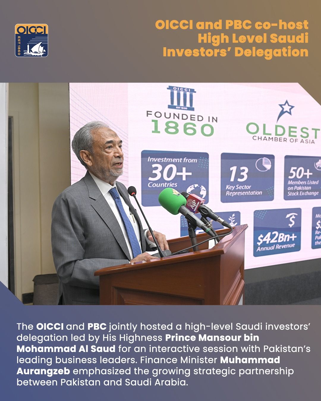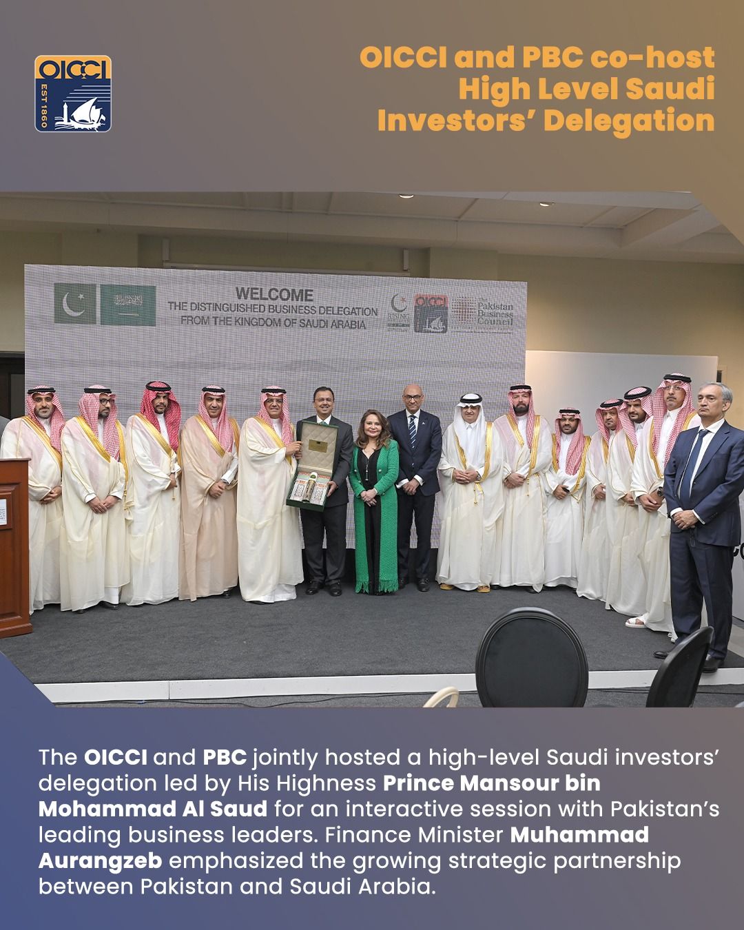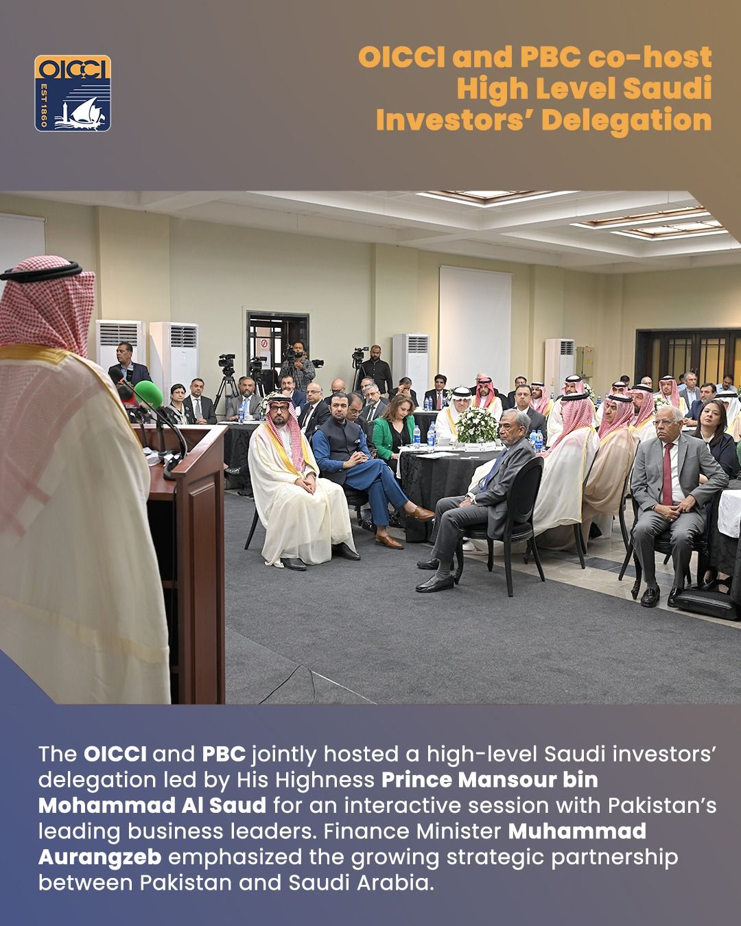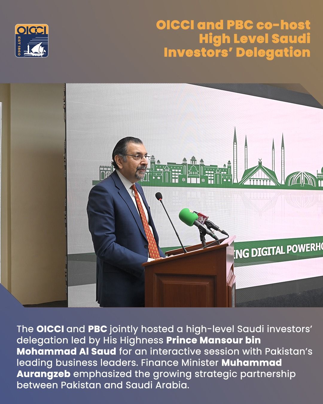 The delegation was welcomed at the OICCI by President OICCI Yousaf Hussain, Secretary General M Abdul Aleem, PBC Chairperson Dr. Zeelaf Munir, and PBC CEO Javed Kureishi. The meeting was also graced by the presence of Finance Minister Muhammad Aurangzeb, who highlighted that the partnership between Pakistan and Saudi Arabia is entering a new phase of strategic cooperation that must now evolve into deeper economic collaboration and shared prosperity.