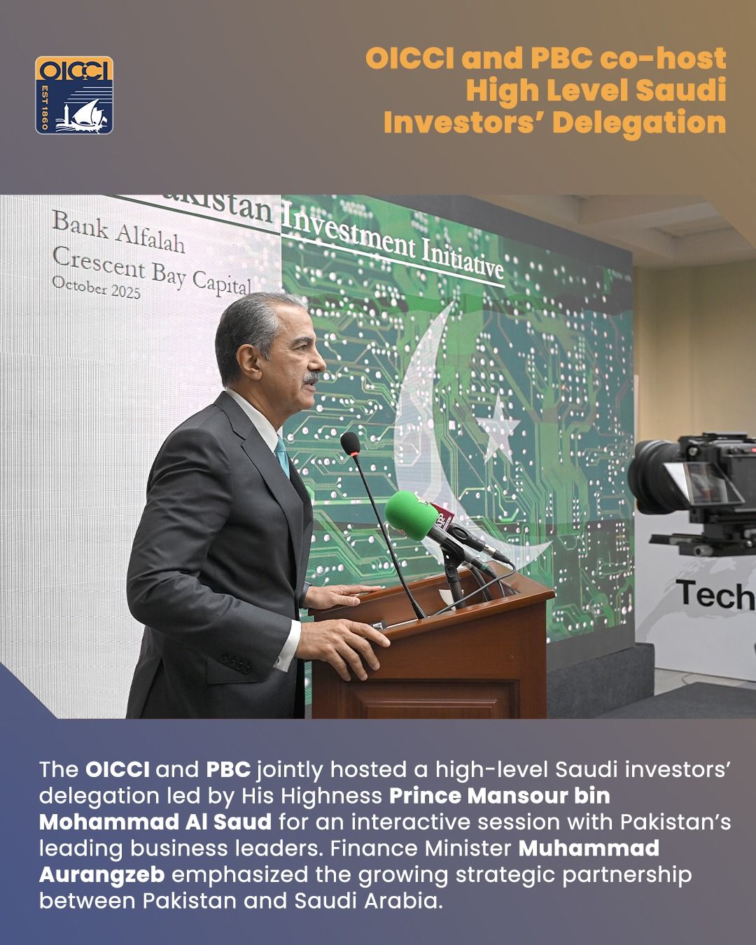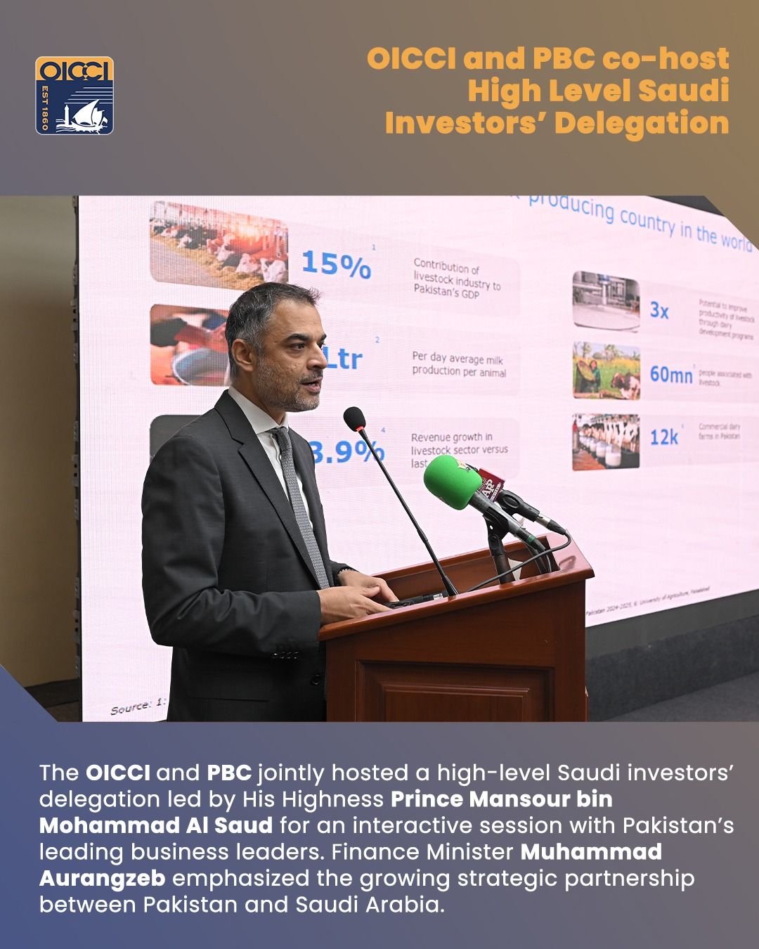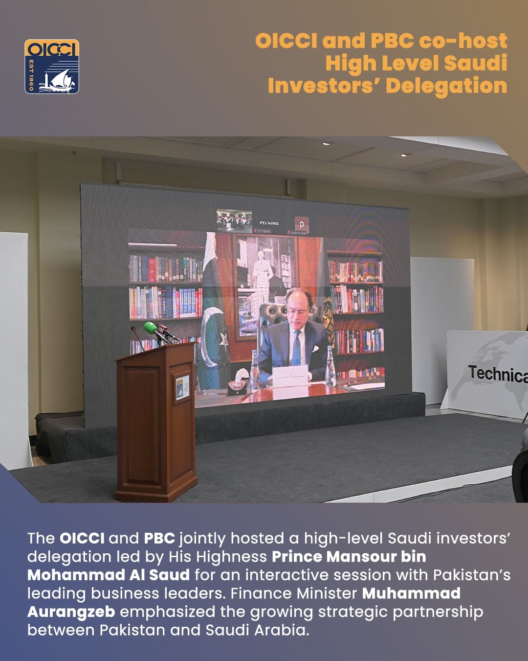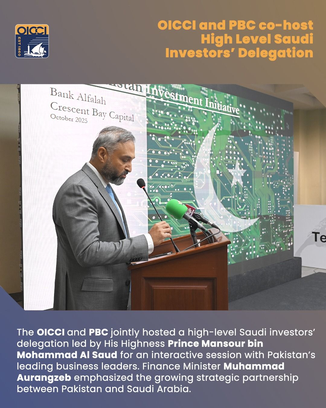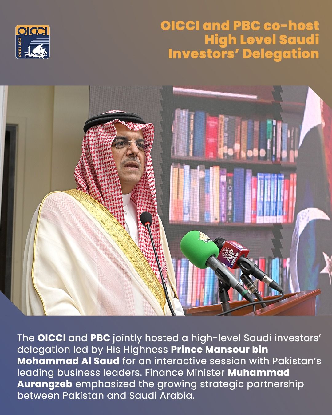 The delegation was welcomed at the OICCI by President OICCI Yousaf Hussain, Secretary General M Abdul Aleem, PBC Chairperson Dr. Zeelaf Munir, and PBC CEO Javed Kureishi. The meeting was also graced by the presence of Finance Minister Muhammad Aurangzeb, who highlighted that the partnership between Pakistan and Saudi Arabia is entering a new phase of strategic cooperation that must now evolve into deeper economic collaboration and shared prosperity.