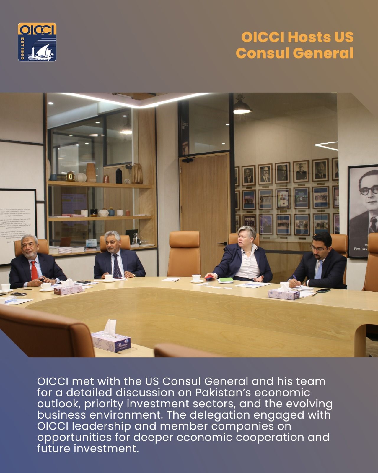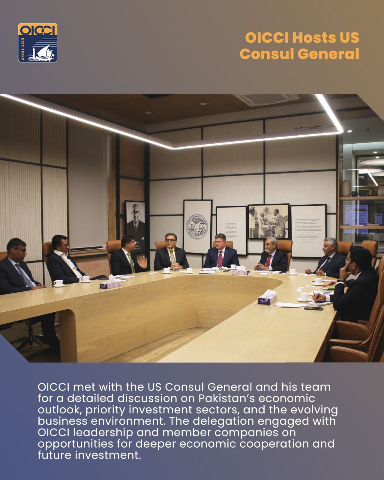 OICCI hosted a high-level delegation from the US Consulate General Karachi led by Consul General, Mr. Charles Goodman, accompanied by Economic Head, Ms. Daniela Garreton, and Economic Specialist, Mr. Fahd A. Zaidi on December 9, 2025. They were welcomed by OICCI Secretary General, Mr. M Abdul Aleem, and Executive Director, Mr. Kashif Shafi.