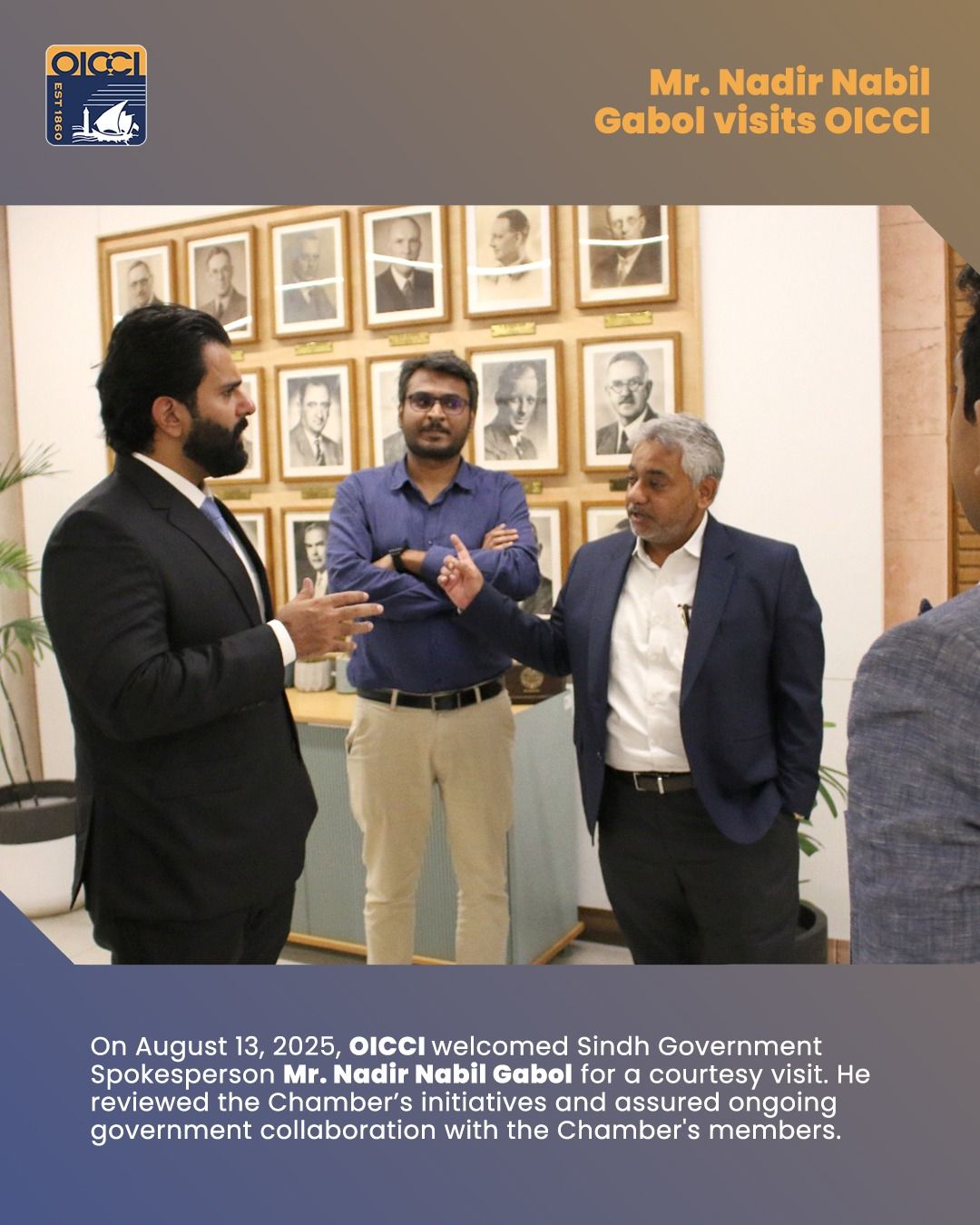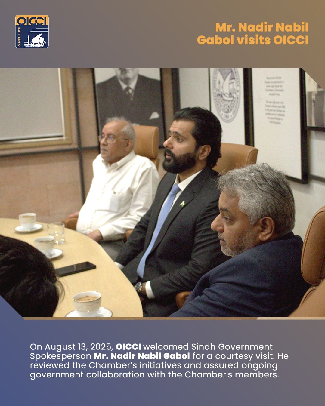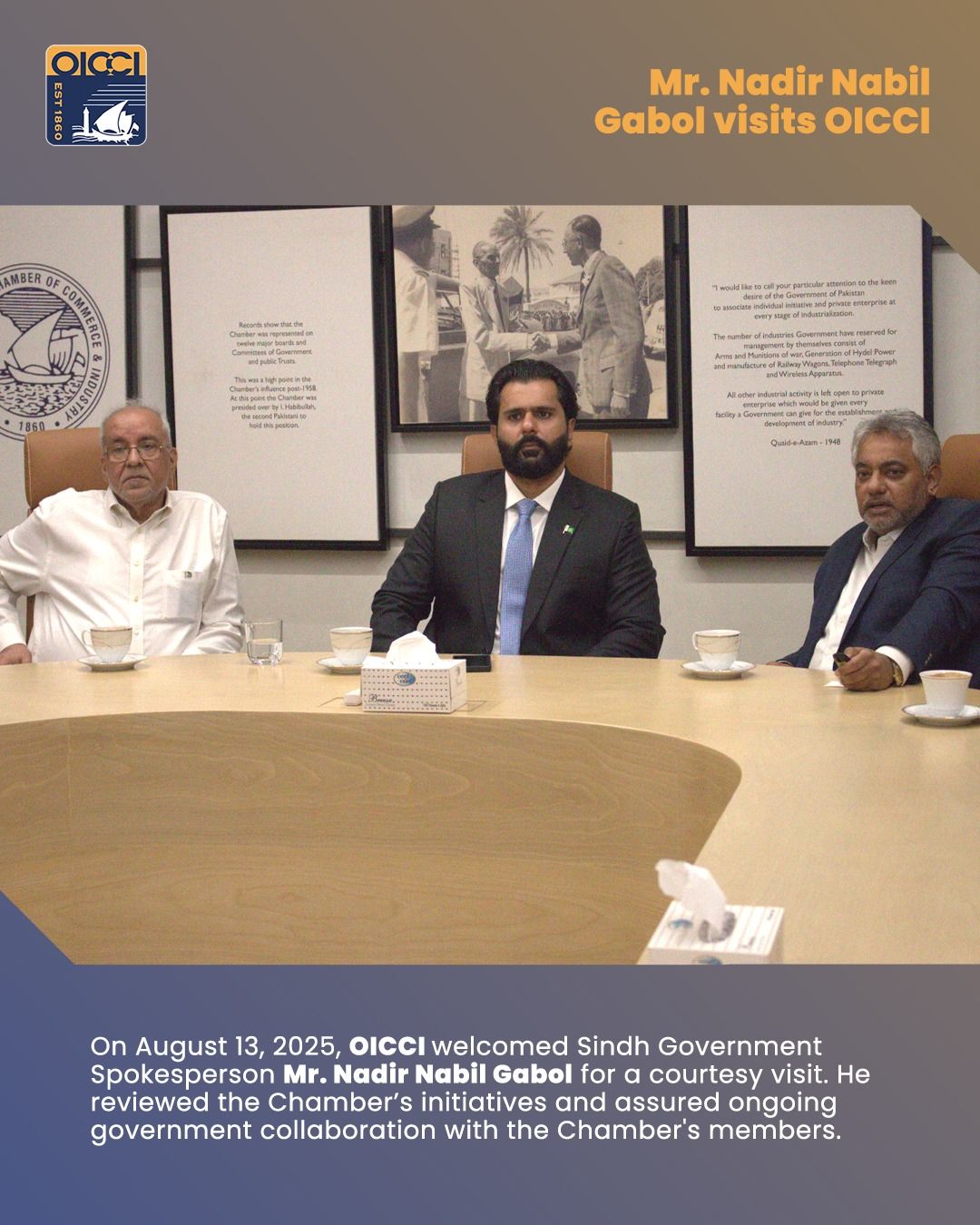 The OICCI (Overseas Investors Chamber of Commerce and Industry) welcomed Spokesperson for the Government of Sindh, Mr. Nadir Gabol, for a courtesy visit on August 13, 2025. He was received by OICCI Executive Director, Mr. Kashif Shafi, Corporate Communications Lead, Mr. Humayoun Khan, and Senior Corporate Manager, Public Affairs & Media Relations at Nestle Pakistan, Mr. Muhammad Rahat Hussain.